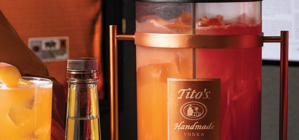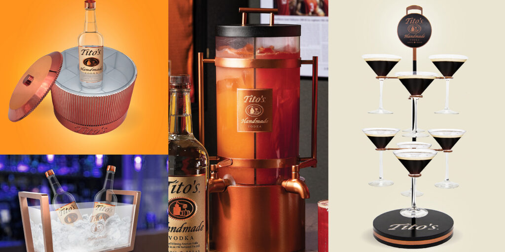 We design and produce custom activation assets for Tito’s that reflect the craftsmanship of the brand. The program includes a custom dual dispenser that highlights Tito’s dedication to batched cocktail recipes, showcasing two different concoctions side-by-side. The design is inspired by the copper details of Tito’s bottle and coordinates with the brand’s existing barware, evoking the charm of the original copper still while adding modern touches.