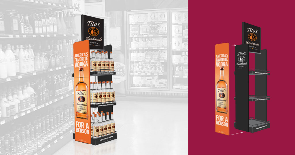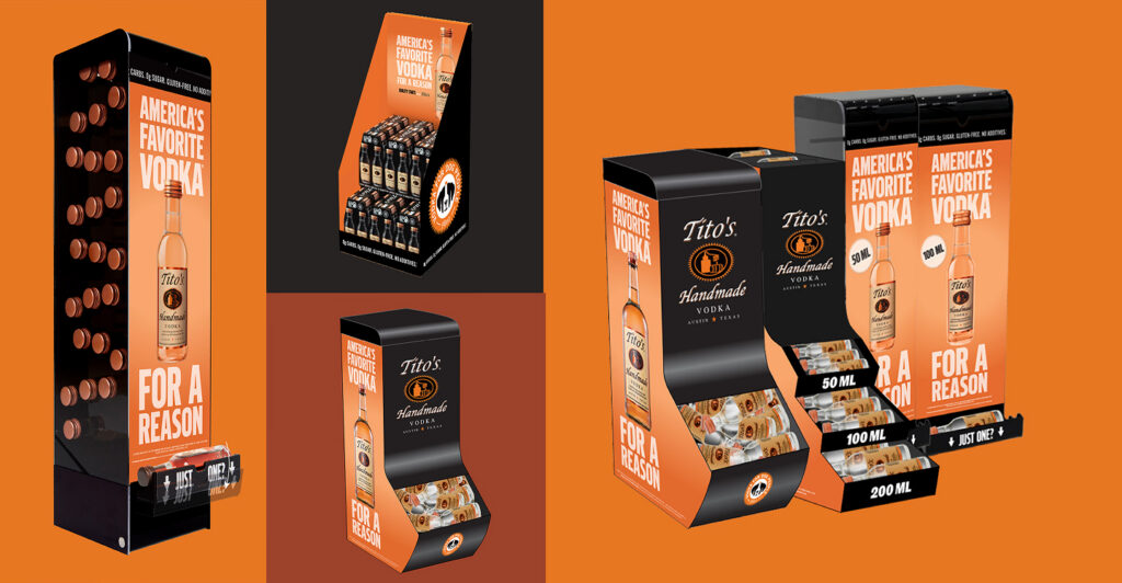 We designed a range of promotional shippers and case displays for Tito’s that work across bottle sizes and retail formats. Each configuration, from countertop units to full floor shippers, maintains a consistent brand look through bold graphics and a modular structure. The system gives Tito’s high impact visibility at the case level while keeping production efficient and adaptable across campaigns.